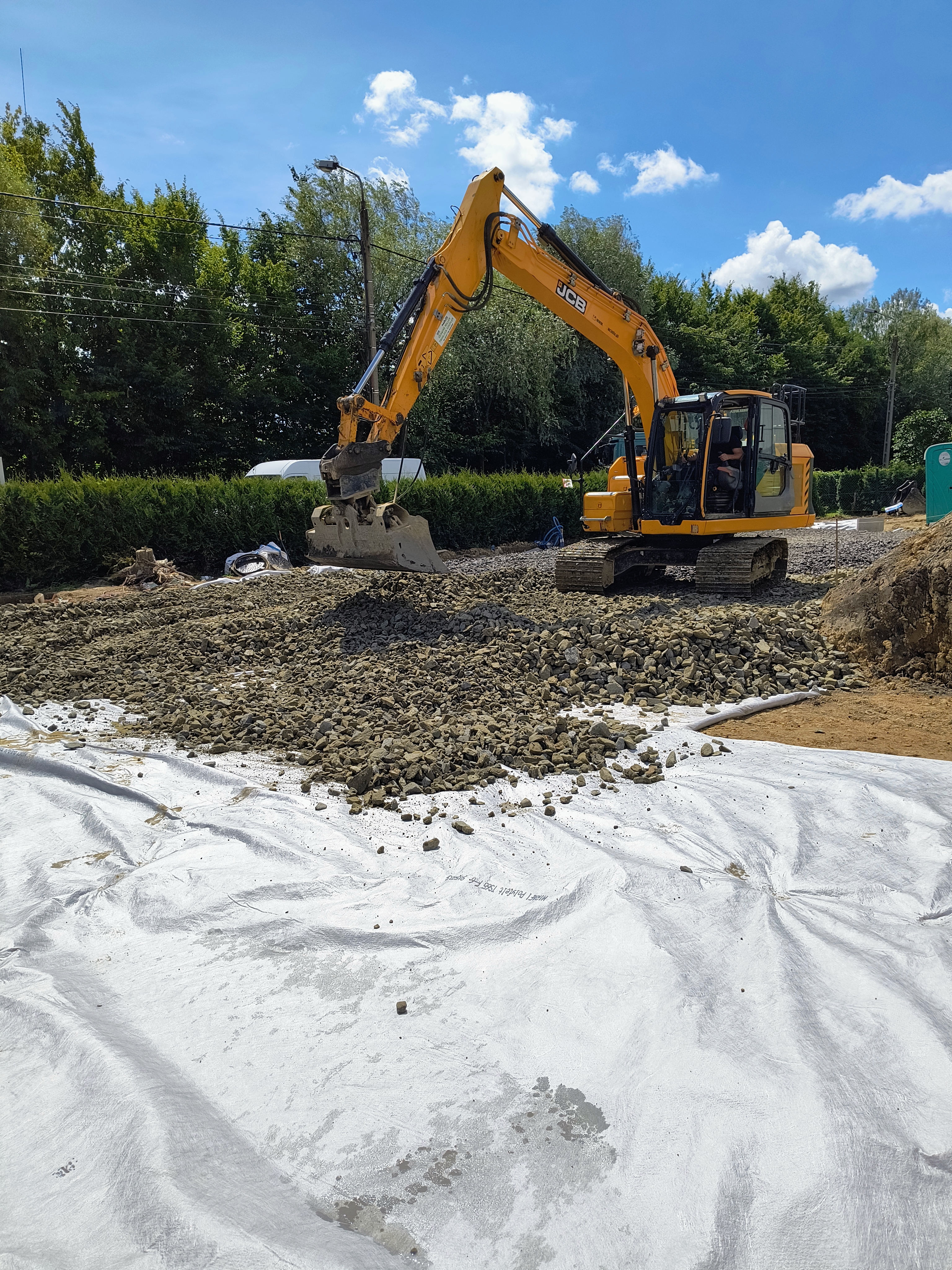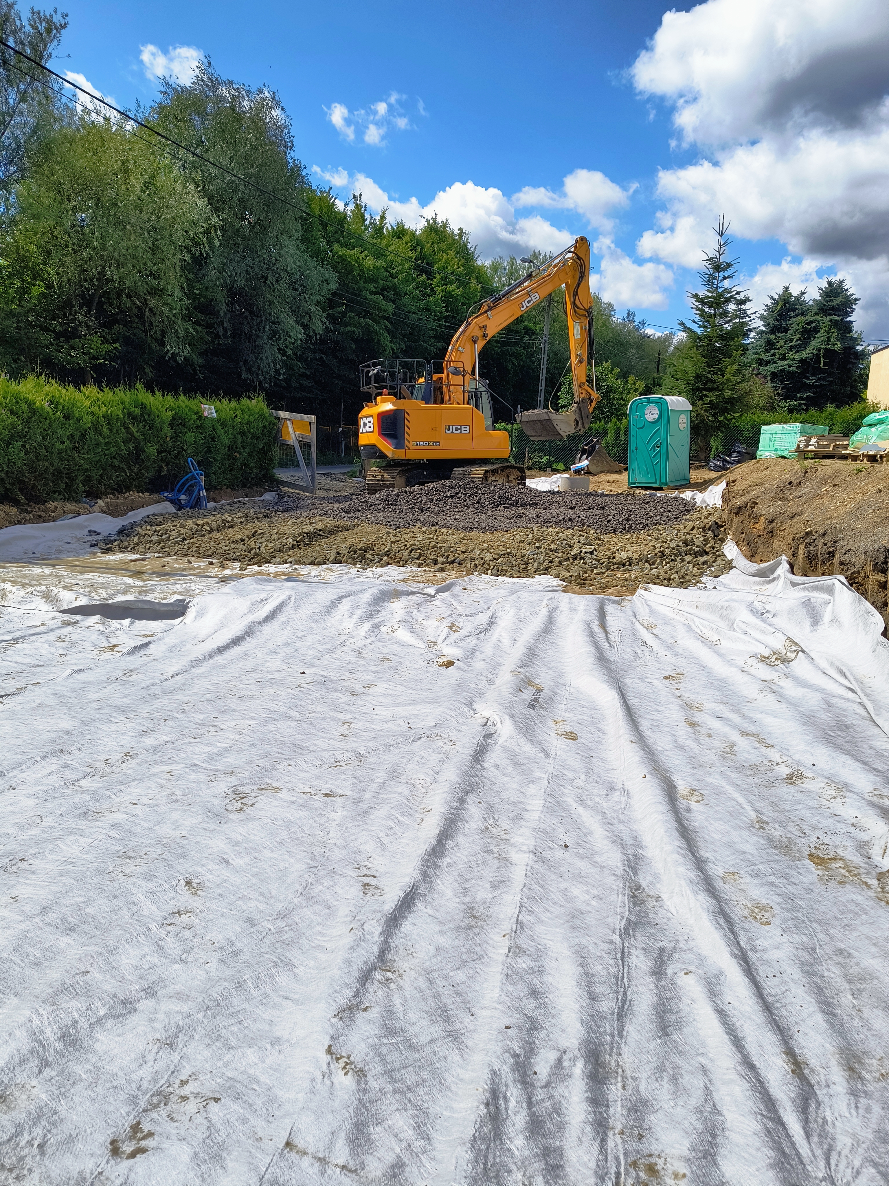Rozłożenie geowłókniny zapobiegającej mieszania się kruszywa z ziemią oraz stabilizującą grunt.